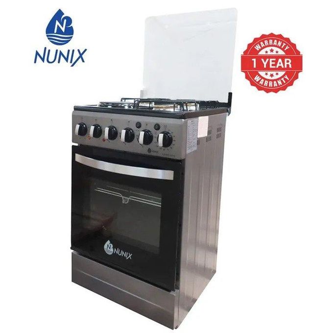 Cook with style and efficiency using the Nunix 50cm x 55cm Cooker. Features 3 gas burners, 1 electric hotplate, and an electric oven. Comes with a 1-year warranty for peace of mind.